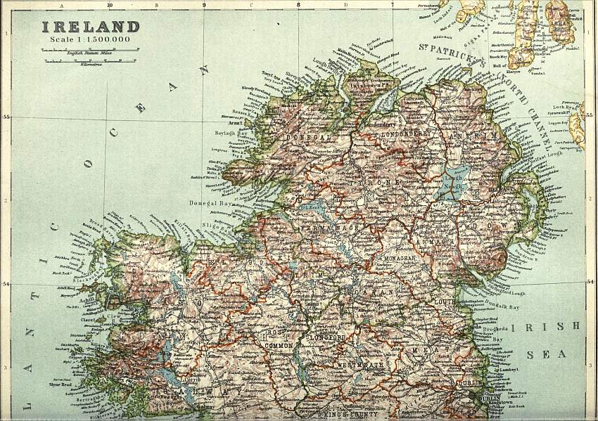 IRELAND, an island lying west of Great Britain, and forming with it the United Kingdom of Great Britain and Ireland. It extends from 51° 26′ to 55° 21′ N., and from 5° 25′ to 10° 30′ W. It is encircled by the Atlantic Ocean, and on the east is separated from Great Britain by narrow shallow seas, towards the north by the North Channel, the width of which at the narrowest part between the Mull of Cantire (Scotland) and Torr Head is only 13½ m.; in the centre by the Irish Sea, 130 m. in width, and in the south by St George’s Channel, which has a width of 69 m. between Dublin and Holyhead (Wales) and of 47 m. at its southern extremity. The island has the form of an irregular rhomboid, the largest diagonal of which, from Torr Head in the north-east to Mizen Head in the south-west, measures 302 m. The greatest breadth due east and west is 174 m., from Dundrum Bay to Annagh Head, county Mayo; and the average breadth is about 110 m. The total area is 32,531 sq. m.
