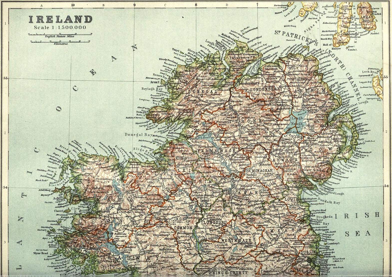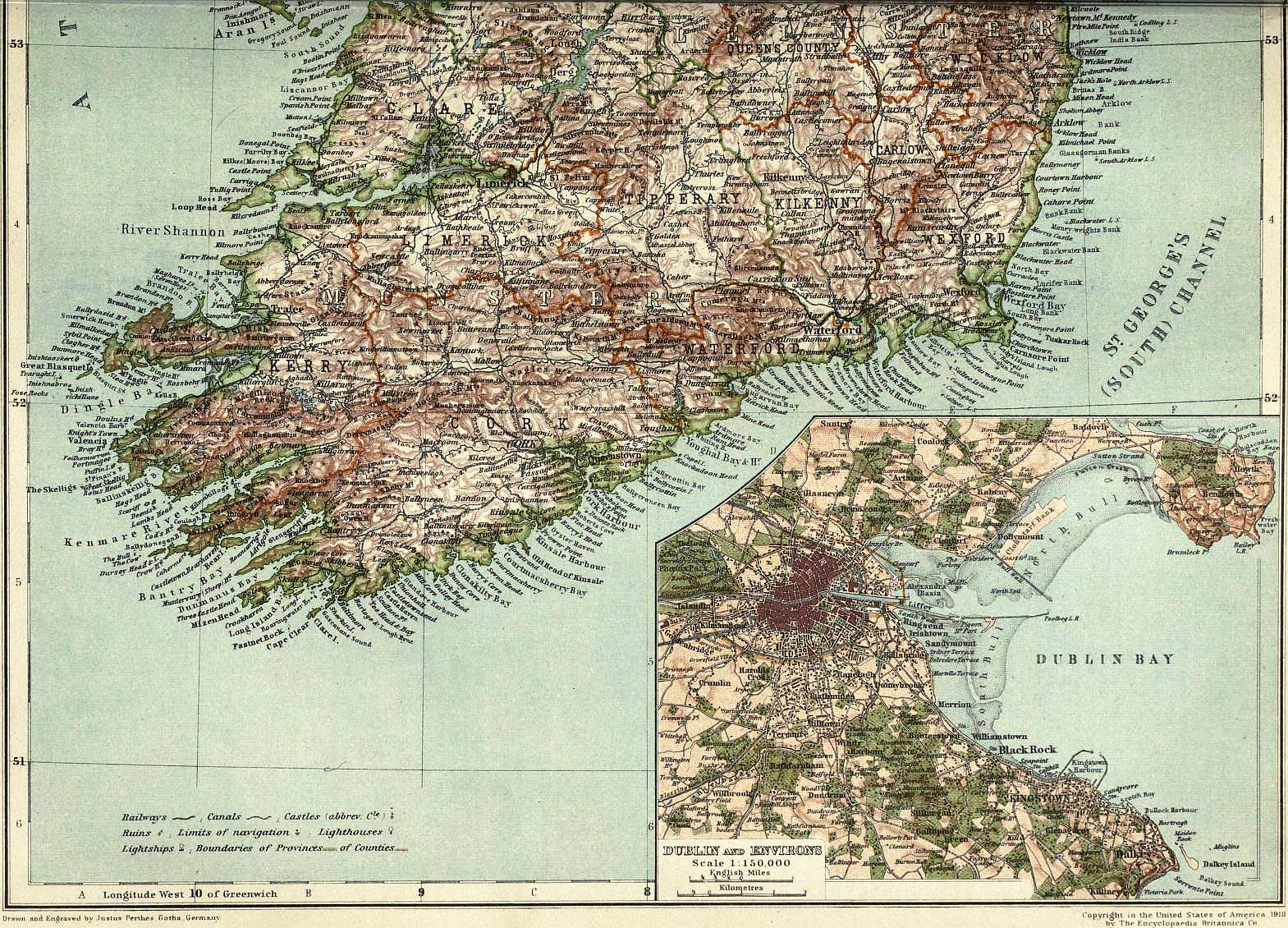 Ireland is divided territorially into four provinces and thirty-two counties:—(a) Ulster (northern division): Counties Antrim, Armagh, Cavan, Donegal, Down, Fermanagh, Londonderry, Monaghan, Tyrone. (b) Leinster (eastern midlands and south-east): Counties Carlow, Dublin, Kildare, Kilkenny, King’s County, Longford, Louth, Meath, Queen’s County, Westmeath, Wexford, Wicklow. (c) Connaught (western midlands): Counties Galway, Leitrim, Mayo, Roscommon, Sligo. (d) Munster (south-western division): Counties Clare, Cork, Kerry, Limerick, Tipperary, Waterford.