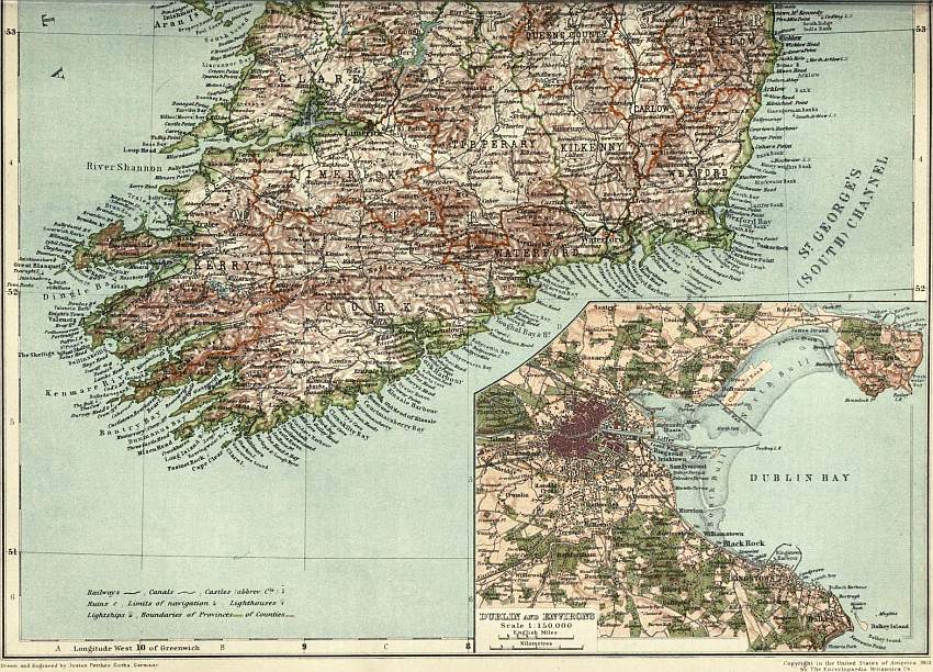 Physical Geography.—Ireland stands on the edge of the European “continental shelf.” Off the peninsula of Mullet (county Mayo) there are 100 fathoms of water within 25 m. of the coast which overlooks the Atlantic; eastward, northward and southward, in the narrow seas, this depth is never reached. The average height of the island is about 400 ft., but the distribution of height is by no means equal. The island has no spinal range or dominating mountain mass. Instead, a series of small, isolated clusters of mountains, reaching from the coast to an extreme distance of some 70 m. inland, almost surrounds a great central plain which seldom exceeds 250 ft. in elevation. A physical description of Ireland, therefore, falls naturally under three heads—the coasts, the mountain rim and the central plain.