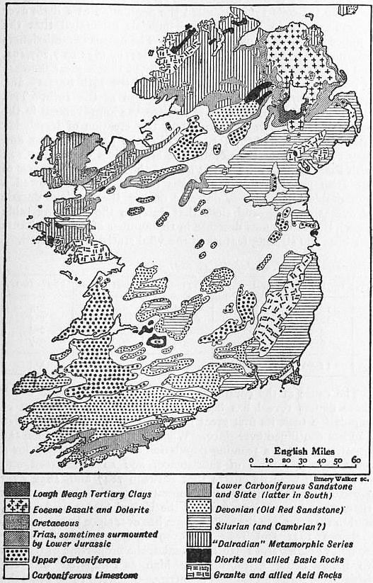 Geology.—Ireland, rising from shallow seas on the margin of the submarine plateau of western Europe, records in its structure the successive changes that the continent itself has undergone. The first broad view of the country shows us a basin-shaped island consisting of a central limestone plain surrounded by mountains; but the diverse modes of origin of these mountains, and the differences in their trend, suggest at once that they represent successive epochs of disturbance. The north-west highlands of Donegal and the Ox Mountains, with their axes of folding running north-east and south-west, invite comparison with the great chain of Leinster, but also with the Grampians and the backbone of Scandinavia. The ranges from Kerry to Waterford, on the other hand, truncated by the sea at either end, are clearly parts of an east and west system, the continuation of which may be looked for in South Wales and Belgium. The hills of the north-east are mainly the crests of lava-plateaux, which carry the mind towards Skye and the volcanic province of the Faeroe Islands. The two most important points of contrast between the geology of Ireland and that of England are, firstly, the great exposure of Carboniferous rocks in Ireland, Mesozoic strata being almost absent; and, secondly, the presence of volcanic rocks in place of the marine Eocene of England.