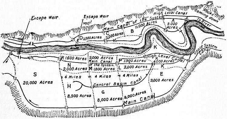 In addition to all these great engineering systems, southern India is covered with minor works of irrigation, some drawn from springs in the sandy beds of rivers, some from the rainfall of ½ sq. m. ponded up in a valley. In other cases tanks are fed from neighbouring streams, and the greatest ingenuity is displayed in preventing the precious water from going to waste.