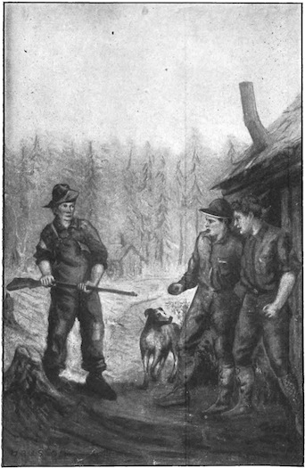 About ten o’clock they received a wire from Nate saying that he would arrive in Bangor about noon and would bring the Airedale with him. True to his promise in the telegram, the old guide appeared at the hotel shortly after the noon hour set in and with him was Sandy. The boys were seated in some of the arm chairs that dotted the lobby, and in less than a moment the dog had found his friends, and nearly knocked over half a dozen people in his haste and eagerness to reach the trio, for despite the fact that an Airedale is called a one man dog, he distributed his friendship equally among the three chums.