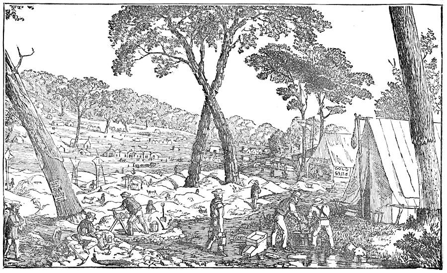 "Come to Canadian Gully, buckets of rich washing-stuff were hoisted up from the claim, and examined by Sir Charles, who was astonished at seeing numerous golden particles in the dirt. One fine nugget challenged particular observation, and this Pat picked out with his fingers, and presented in a most gracious manner to Lady Hotham, although he had no interest whatever in the claim. The operation of puddling and cradling was gone through, to the great satisfaction of the vice-regal pair, who expressed their warm thanks, Sir Charles emphatically asking, 'What can I do for you, my friends, in return for your kindness?' whereupon the ready-witted Celt, bowing respectfully, impressively replied, 'Abolish the license tax.' This was the signal for renewed cheering; and as there was an expressed anxiety to have a reply, Sir Charles informed the multitude that if they would accompany him to the camp, where he intended to address them, they would learn his sentiments on the matter.
