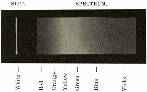 The two ends of the spectrum gradually fade away into darkness, and the point that I wish to insist upon and make perfectly clear is this:—The position of the boundaries terminating the visible spectrum does not depend upon anything whatever in the nature of light regarded as a physical phenomenon. Ether waves which are much longer and much shorter than those which illuminate the spectrum certainly exist, and evidence[Pg 14] of their existence is easily obtainable. But we cannot see them; they fall upon our eyes without exciting the faintest sensation of light. The visible spectrum is limited solely by the physiological constitution of our organs of vision, and the fact that it begins and ends where it does is, from a physical point of view, a mere accident. The spectrum actually projected upon the screen is in truth much longer than that portion of it which any one can see: it extends for a considerable distance beyond the violet at the one end and beyond the red at the other, these invisible portions being known as the ultra-violet and infra-red regions. People’s eyes differ in regard to range of sensibility just as their ears do. I believe the sensibility of my own eyes to be normal, but if I were[Pg 15] to indicate the two points where the spectrum appears to me to begin and to end, a great many persons would certainly be inclined to disagree with me and place the boundaries somewhere else. Some, indeed, could see nothing whatever in what appears to most of us to be a brilliant portion of the red.