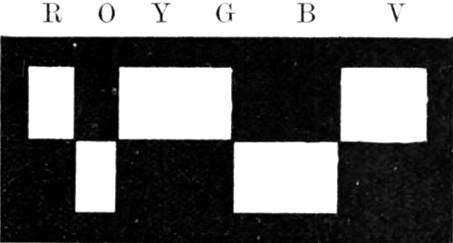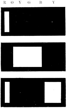 More recently a fresh series of experiments were undertaken in connection with the Young effect and certain allied matters, the results being embodied in a communication to the Royal Society (Proc. Roy. Soc., 1894, vol. 56, p. 132). Among other things an attempt was made to ascertain how far a recurrent image was affected by the colour of the exciting[Pg 177] light. With this object two methods of experimenting were employed. In the first, coloured light was obtained by passing white light through coloured glasses; in the second and more perfect series of experiments, the pure coloured light of the spectrum was used. Among other results it was found that, cæteris paribus, the recurrent image was much stronger with green light than with any other, and that when the excitation was produced by pure red light, however intense, there was no recurrent image at all.