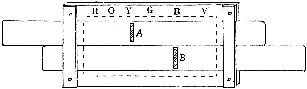 A simpler apparatus is, however, quite sufficient for showing the phenomenon,[12][Pg 206] and with practice one can even acquire the power of seeing it without any artificial aid at all. I have many times noticed flashes of red upon the black letters of a book that I was reading, or upon the edges of the page: bright metallic, or polished objects often show it when they pass across the field of vision in consequence of a movement of the eyes, and it was an accidental observation of this kind which suggested the following easy way of exhibiting the effect experimentally.