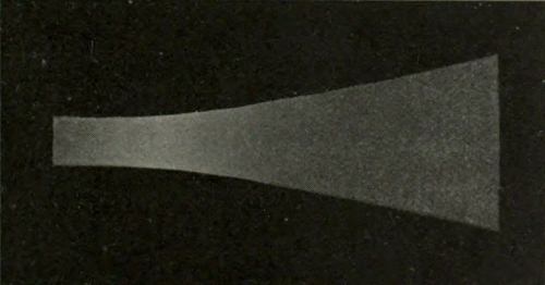 In order to see the effect distinctly by Charpentier’s original method, the illumination must be strong. If, howover, the arrangement is slightly varied, so that transmitted instead of reflected light is made use of, comparatively feeble illumination is sufficient. A very effective way is to turn a small metal[Pg 190] disk, having an open sector of about 60°, in front of a sheet of ground or opal glass behind which is a lamp. By an arrangement of this kind upon a larger scale, the effect may easily be rendered visible to an audience. The eyes should not be allowed to follow the disk in its rotation, but should be directed steadily upon the centre.