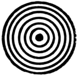 In none of these experiments does an extended black surface ever appear red, but only black dots or lines. And the lines must not be too thick; if their thickness is much more than a millimetre (1⁄25 inch), the lines, as seen by an observer from the usual distance for reading, do not become red throughout,[Pg 212] but only along their edges. The red appearance does not in fact originate in the black lines themselves: these serve merely as a background for showing up the red border which fringes externally the white portions of the paper, and the width of this border does not exceed about one-fifth of a degree. But by employing a sufficiently large disk and selecting designs or letters composed of lines of suitable thickness, the colour effect has been shown to a large audience.