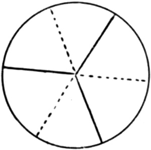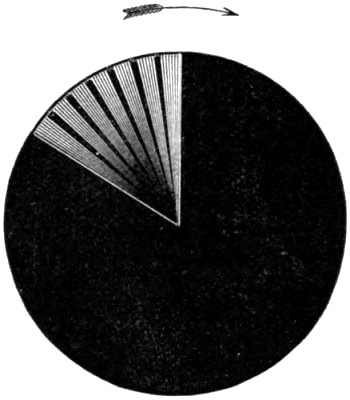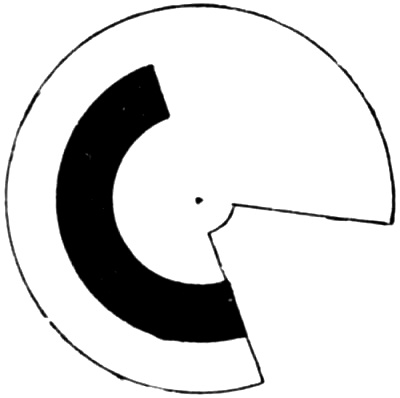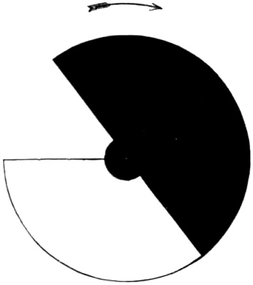 The apparatus which Charpentier employed for demonstrating and measuring the duration of this effect is very simple. It consists of a blackened disk with a white sector, mounted upon an axis. When the disk is illuminated by sunlight and turned rather slowly, the direction of the gaze being fixed upon the centre, there appears upon the white sector,[Pg 188] close behind its leading edge, a narrow but quite conspicuous dark band. (See Fig. 39.) The portion of the retina which at any moment is apparently occupied by the dark band, is that upon which the light reflected by the leading edge of the white sector impinged one sixtieth of a second previously.