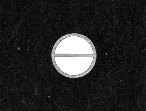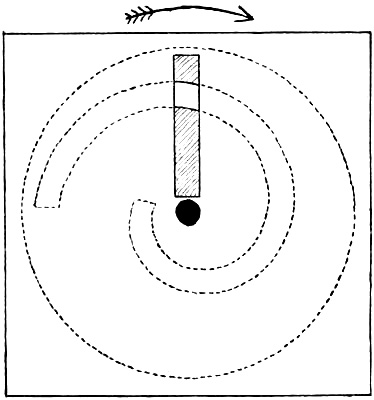 When the disk is turned in the opposite direction, so that the gap is preceded by white and followed by black, the lines of the design appear at first sight to become dark blue instead of red. Attentive observation, however, shows that the apparently blue tint is not formed upon[Pg 213] the lines themselves, as the red tint was, but upon the white ground just outside them. This introduces to our notice another border phenomenon, which seems to present itself when a dark patch is suddenly formed on a bright ground, for that is essentially what takes place when the disk is turned the reverse way. I made some attempts to obtain more direct evidence that such a dark patch appeared for a moment to have a blue border, and after some trouble succeeded in doing so.