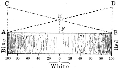 We have in the scale thus presented to our imagination a pair of colours, each occupying one-half of the scale, and gradually diminishing in purity towards the middle line; here only, just at the stage where one colour merges into the other, is there no colour at all, and this region represents the fixed physical zero or standard from which is reckoned the[Pg 159] purity of a colour corresponding to any other portion of the scale. The completed scale, it will be observed, though originally intended only for the case of red, turns out to be equally serviceable for greenish-blue: if we consider greenish-blue as positive, then the red, being on the other side of zero, must be regarded as negative. Any other possible pairs of complementary colours may be similarly treated.