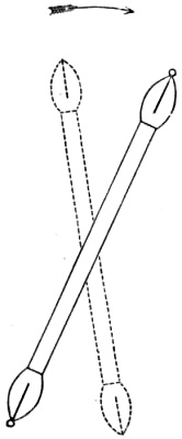 Some years ago I called attention to a very different method of exhibiting a recurrent image. The apparatus used for the purpose consists of a vacuum tube mounted in the usual way upon a horizontal axis capable of rotation. When the tube is illuminated by a rapid succession of discharges from an induction coil, and is made to rotate very slowly by clockwork (turning once in[Pg 175] every two or three seconds), a very curious phenomenon may be noticed. At a distance of a few degrees behind the tube and separated from it by an interval of perfect darkness, comes a ghost. This ghost is in form an exact reproduction of the tube; it is very clearly defined, and though its apparent luminosity is somewhat feeble, it can in most cases be seen without difficulty. The varied colours of the original are, however, absent, the whole of the phantom tube being of a uniform bluish or violet tint. If the rotation is suddenly stopped the ghost still moves steadily on until it reaches the luminous tube, with which it coalesces and so disappears. (See Fig. 36, where the recurrent image is represented by dotted lines.)