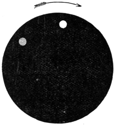 For a repetition of my first experiment a mechanical lantern slide is required containing a metal disk about three inches in diameter which can be caused to rotate slowly and steadily about its centre. Near the edge of the disk is a small circular aperture. The slide is placed in a limelight lantern, and a bright image of the hole is focussed upon a distant screen, all other light being carefully shut off. When the disk is turned slowly, the spot of light upon the screen goes round and round, and it is generally possible to see at once that the bright primary spot appears to be followed at a short distance by a much feebler spot of a violet colour, which is[Pg 179] the recurrent image of the first. (See Fig. 37.) It is essential to keep the direction of the eyes perfectly steady, which is not a very easy thing to do without practice.
