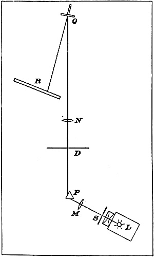 The arrangement adopted is shown in the annexed diagram (Fig. 38). L is a lantern containing an oxyhydrogen light or an electric arc lamp, S is an adjustable slit, M a projection lens, P a bisulphide of carbon prism, D a metal plate in the middle of which is a circular aperture 2 millimetres (1⁄12 inch) in diameter. A bright spectrum, 6 or 7 centimetres in length (about 3 inches), is projected upon this metal plate, and a small selected[Pg 182] portion of it passes through the round hole; thence the coloured light goes through the lens N to the little mirror Q, which reflects it upon the white screen R. By properly adjusting the position of the lens N a sharp monochromatic image of the round hole in the plate D is focussed upon the screen R. To the back of the mirror Q is attached a horizontal arm which is not quite perpendicular to the mirror, its inclination being capable of adjustment. The arm is turned slowly by clock-work, thus causing the coloured spot on the screen to revolve in a circular orbit about 30 centimetres (1 foot) in diameter, its recurrent image following at a short distance behind it. When the mirror turns once in 1½ seconds, this image appears about 50° behind the coloured[Pg 183] spot, the corresponding time-interval being about one-fifth of a second.