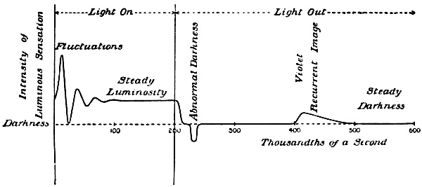 Recurrent vision is, no doubt, generally most conspicuous after a very brief period of retinal illumination, such as was employed in the experiments which we have been discussing; this is evidently due to the fact that the effect is most easily perceived when the sensibility of the retina has not been impaired by fatigue. But by a little effort it may be detected even after very prolonged illumination, and a practised observer can hardly avoid noticing a short flash of bluish light which manifests itself[Pg 185] about a quarter of a second after the lights in a room have been suddenly extinguished; the phenomenon forces itself upon my attention almost every night when I turn off the electric lights. It need hardly be pointed out that it represents only a transient phase of the well known positive after-image, and it had even been observed in a vague and uncertain sort of way long before the date of Professor Young’s experiment. Helmholtz, for example, mentions the case of a positive after-image which seemed to disappear and then to brighten up again, but he goes on to explain—erroneously, as it turns out—that the seeming disappearance was illusory.