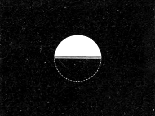 A circular aperture was cut in a wooden board and covered with white paper; a lamp was placed behind the board, and thus a bright disk was obtained, as in the former experiment. An arrangement was prepared by means of which one half of this bright disk could[Pg 214] be suddenly covered by a metal shutter, and it was found that when this was done a narrow blue band appeared on the bright ground just beyond and adjoining the edge of the shutter when it had come to rest. The blue band lasted for about a tenth of a second, and it seemed to disappear by retreating into the black edge of the shutter. The phenomenon is illustrated in Fig. 48, where the shaded band indicates the blue border.