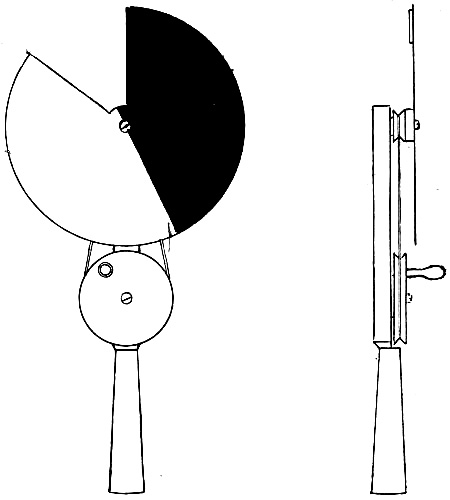 We may go a step further. Cut out a disk of white cardboard, divide it into two equal parts by a straight line through the centre, and paint one half black.[13] At the junction of the black and white portions cut out a gap, which may conveniently be of the form of a sector of 45°. (See Fig. 47.) Stick a long pin through the centre and hold the arrangement by the pointed end of the pin a few inches above a printed page near a good light. Make the disk spin at the rate of about five or six turns a second by striking the edge with the finger. As before, the letters when seen through the gap will appear red, and persistence will render the repeated[Pg 211] impressions almost continuous so long as the rotation is kept up; any one seeing the printing for the first time through the rotating disk would believe that it was done with red ink. Care must be taken that the disk does not cast a shadow upon the page, and that the intensity of the illumination is properly adjusted. I have devised several rather more elaborate contrivances for making the disks rotate at a uniform speed; one of these is shown in Fig. 50.
