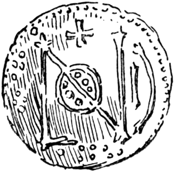 Fig. 14.—Coin of Halfdan, with Monogram of London. From a unique example in the British Museum. It seems to have been coined on the taking of London by the Dane leader in 872 35