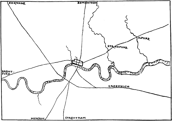 Fig. 17.—London and the Roman Roads: The Watling Street through Greenwich and Edgware; the Erming Street through Merton and Edmonton, called also the Stone Street south of London; the Here Street through Brentford and Stratford 53