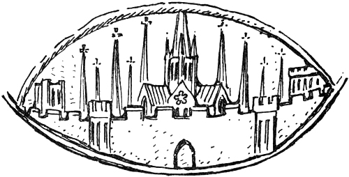 [Pg ix] Fig. 20.—From the Common Seal. Reverse, enlarged, 1224. See also Fig. 23; it shows the city wall with battlements and turrets 78
