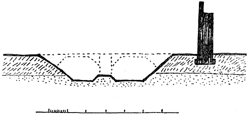 Fig. 21.—Section of Roman Wall and Ditch. Restored from excavation near Aldersgate recorded in Archæologia 80