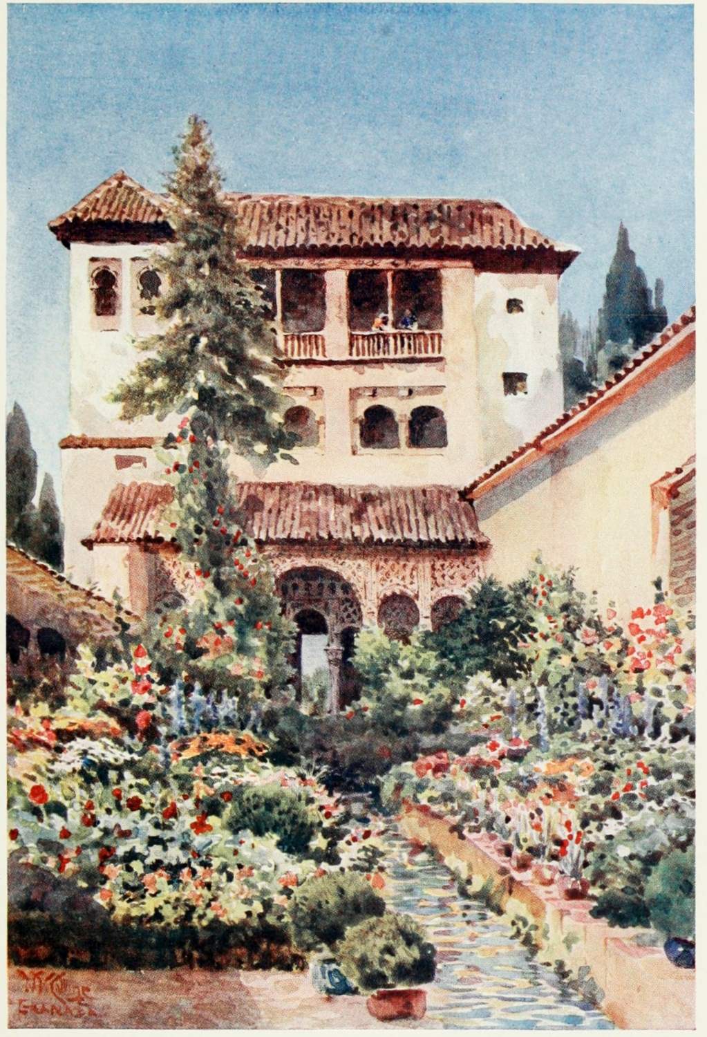 Its courtyards and gardens are its glory. The scent of orange blossom perfumes the air, the fountains splash and play, all is still within these fascinating courts save the tinkle of the water and cooing of doves. Of its orange trees, one was pointed out to me which Pedro the Cruel planted! and many others are known to be over two hundred years old.