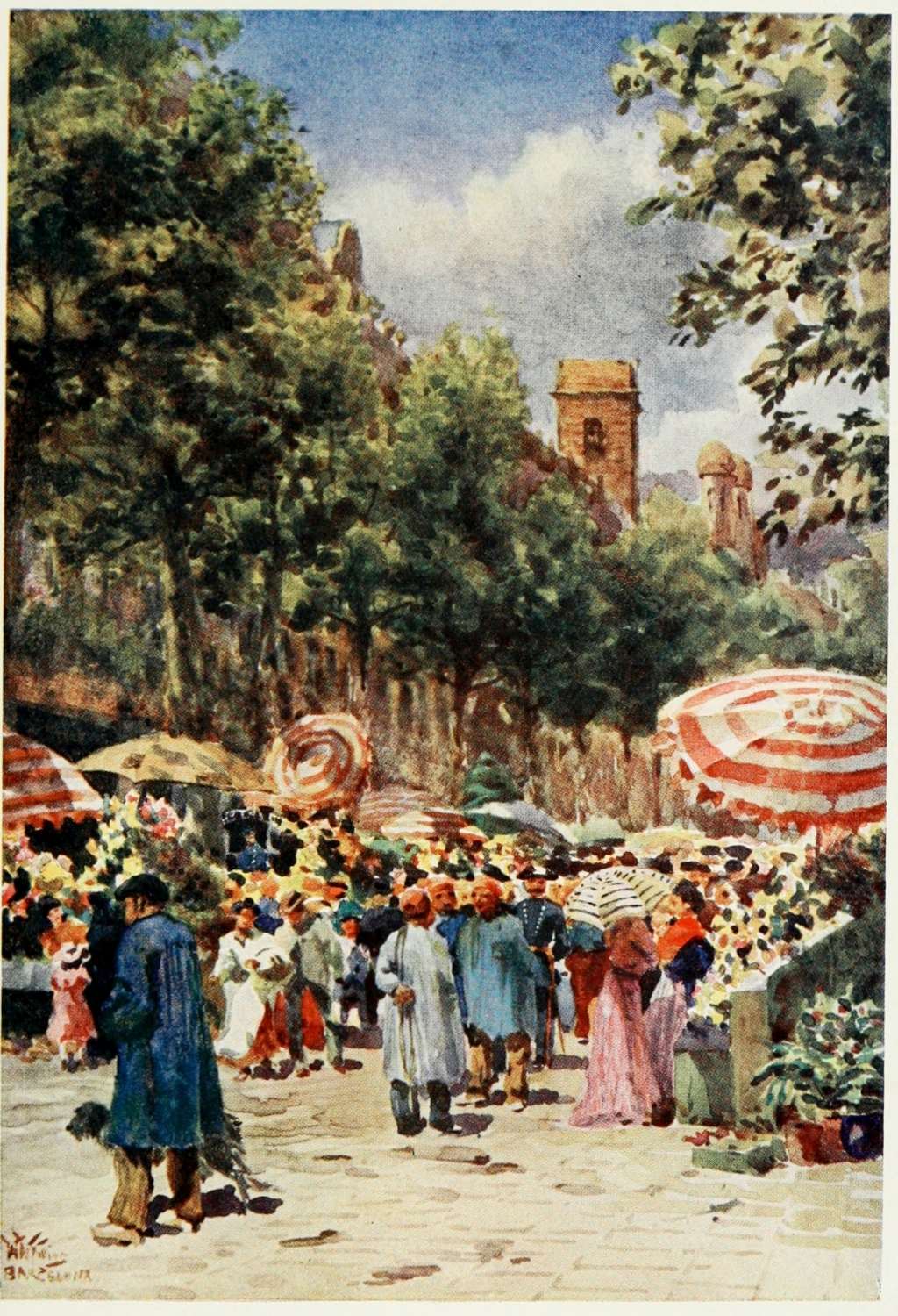 There is another life in Seville, the life of the roofs. In early spring before the great heat comes, and in autumn before the cold winds arrive, the life of the roofs fascinated me. Up on the roofs in the dry atmosphere, Seville's washing hangs out to air, and up on the roofs, in the warm sun, with the hum of the streets far below, you will hear the quaint song—so Arabian in character—of the lavandera, as she pegs out the damp linen in rows. In the evening the click-a-click-click of the castanets and the sound of the guitar, broken by merry laughter, tells one that perhaps the Sevillano has fathomed the mystery of knowing how best to live. And as sundown approaches what lovely colour effects creep o'er this city in the air! The light below fades from housetop and miradore, pinnacle and dome, until the last rays of the departing majesty touch the vane of the Giralda, that superb symbol of Faith,—and all is steely grey.