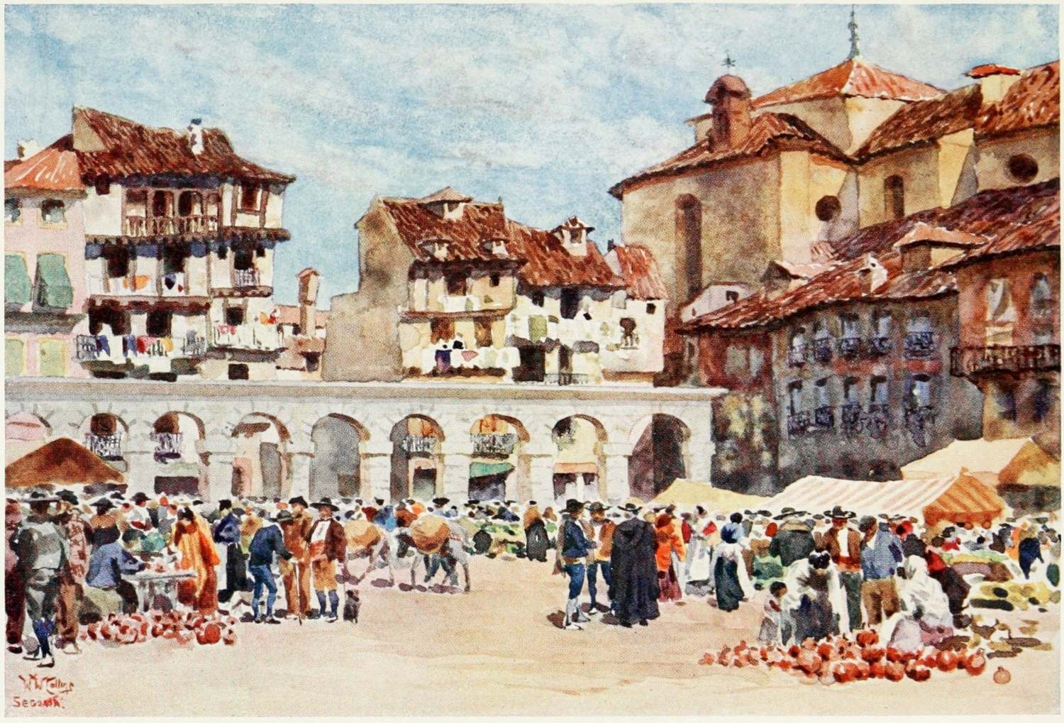 The beggars of Cordova were the most importunate that fate sent across my path in the whole of Spain. I found it impossible to sit in the streets where I would gladly have planted my easel, and it was only by standing with my back to the wall that I was able to make my sketch of the Campanario. These streets are tortuous and narrow, and the houses, built on the Moorish plan with a beautiful patio inside, are low. At many a corner I came across marble columns, some with Roman inscriptions, probably from Italica, placed against the house to prevent undue wear and tear. In the narrowest ways I noticed how the load borne by the patient ass had scooped out a regular track on either wall about three or four feet from the ground. Wherever I went, to the oldest quarters of the town in the south-east corner or the modern in the north-west, I could never rid myself of the feeling that Cordova was a city of the past. Her life is more Eastern than that of Seville, and her people bear more traces of the Moor. Decay and ruin are apparent at every turn, but how picturesque it all is!—the rags, the squalor, and the ruin. How I anathematised those beggars with no legs, or minus arms, when I tried to begin a street sketch! The patience of Job would not have helped me, it was the loathsomeness of these cripples that drove me away. Begging is prohibited in Seville and Madrid and in one or two other towns, would that it were so in Cordova.