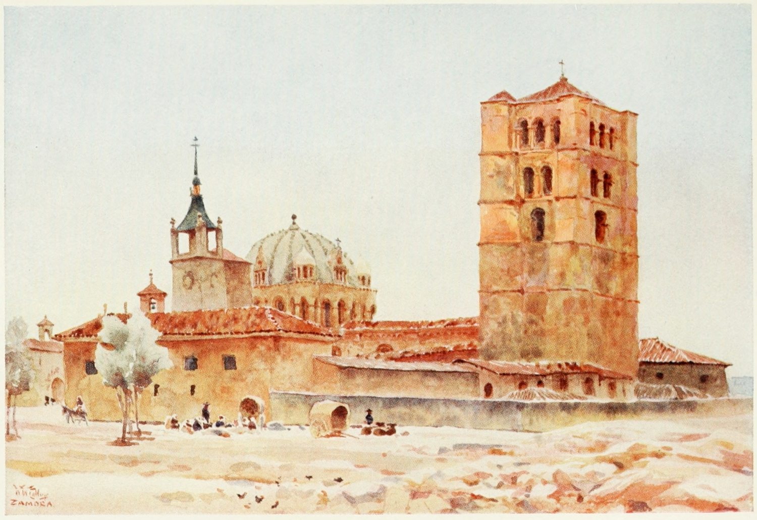 In the mountain fastnesses of Asturias the churches of Santa Maria de Naranco and San Miguel de Lino, dating from the ninth century and contemporary with San Pablo and Santa Cristina, in Barcelona, are the earliest Christian buildings in Spain. As the Moor was pushed further south, a new style followed his retreating steps; and the Romanesque, introduced from over the Pyrenees, became the adopted form of architecture in the more or less settled parts of the country. Creeping south through Leon, where San Isidoro is well worth mention, we find the finest examples of the period in the eleventh and twelfth centuries, at Segovia, Avila, and the grand Catedral Vieja of Salamanca.
