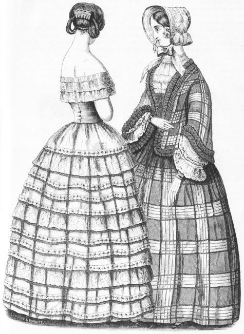 The figure on the left in Figure 1, represents an elegant ball costume. The dress is composed of white crape, the skirt, which is full, being handsomely trimmed with white lace and fullings of crape put on at equal distances; the upper row of lace, reaching to a little below the waist. Plain low corsage, the top part encircled with a double fall of lace, forming a kind of berthe, and headed with a narrow fulling of crape, similar to that on the skirt. This berthe entirely conceals the plain, short sleeve; the whole is worn over a skirt of white satin. The hair is simply arranged in a cable twist, being confined at the back with a gold or silver comb. The figure on the right represents a visiting costume. The dress is a rich plaided silk, composed of a mixture of purple, red, green, and white. The skirt is made quite plain; low corsage, trimmed with a double row of white lace across the front, one row standing up, and the other drooping over the front. Pardessus of the same material, trimmed all round with a quilling of plain purple ribbon. This is repeated upon the lower part of the pagoda sleeves, and also serves to attach the pardessus across the front of the bosom. Under pagoda sleeves are of white lace. The bonnet is of paille d'Italie, lined with white silk, and decorated with pink roses, the exterior having a doubled plaited frill of white silk, and a beautiful white ostrich feather.