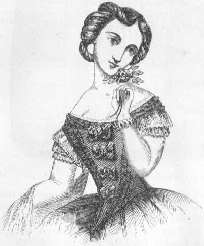 The extremely mild weather which has prevailed during the autumn, has somewhat retarded the preparations for winter; yet the modists have not been unmindful of the passage of the months, and the fact that December always promises frosts and snows. From Paris, the great fountain of taste in dress, elegant bonnets have been received. Some are of white, lilac, pink, and green satin, covered with black lace of rich pattern; others are of black and colored velvets, trimmed with a small feather on each side; the inside trimming composed of velvet flowers and foliage, in tints harmonizing with the color of the bonnet. Pardessus, wadded, and of the same material as the dress, are now generally worn, the patterns varying but little from those depicted in our last Number. Dresses, mantelets, and other articles of costume, are ornamented with braid and embroidery. Embroidered silks are worn, of which the gray, shot with white, and ornamented with embroidered flowers and foliage of gray silk, the stems and tendrils being white, are most in vogue. The corsage is low, open[Pg 144] in front, sleeves demi-long. Another seasonable material for a plain walking and in-door dress, is a French fabric called amure, which consists of a mixture of silk and wool. It is woven in dress lengths.