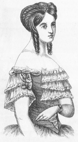 Fig. 2 represents an evening costume. The dress is of satin, of a rich deep American primrose hue, the skirt made quite plain and very full, en petit train; low pointed corsage, trimmed with a fulling of satin ribbon, the same color as the dress, which is put on to form a kind of shallow cape round the back part, and descends upon each side of the front, finishing on either side of the point, and gradually narrowing from the shoulders. It is trimmed with a fall of white lace upon the lower edge, a narrower one forming a beading to the plaiting round the neck. The centre of the corsage is adorned with nœuds of the same colored ribbon, placed at regular distances; the short sleeves finished with a row of fulled ribbon, similar to that on the corsage, edged with a very narrow lace. The coiffure represents the front of the figure on the left.