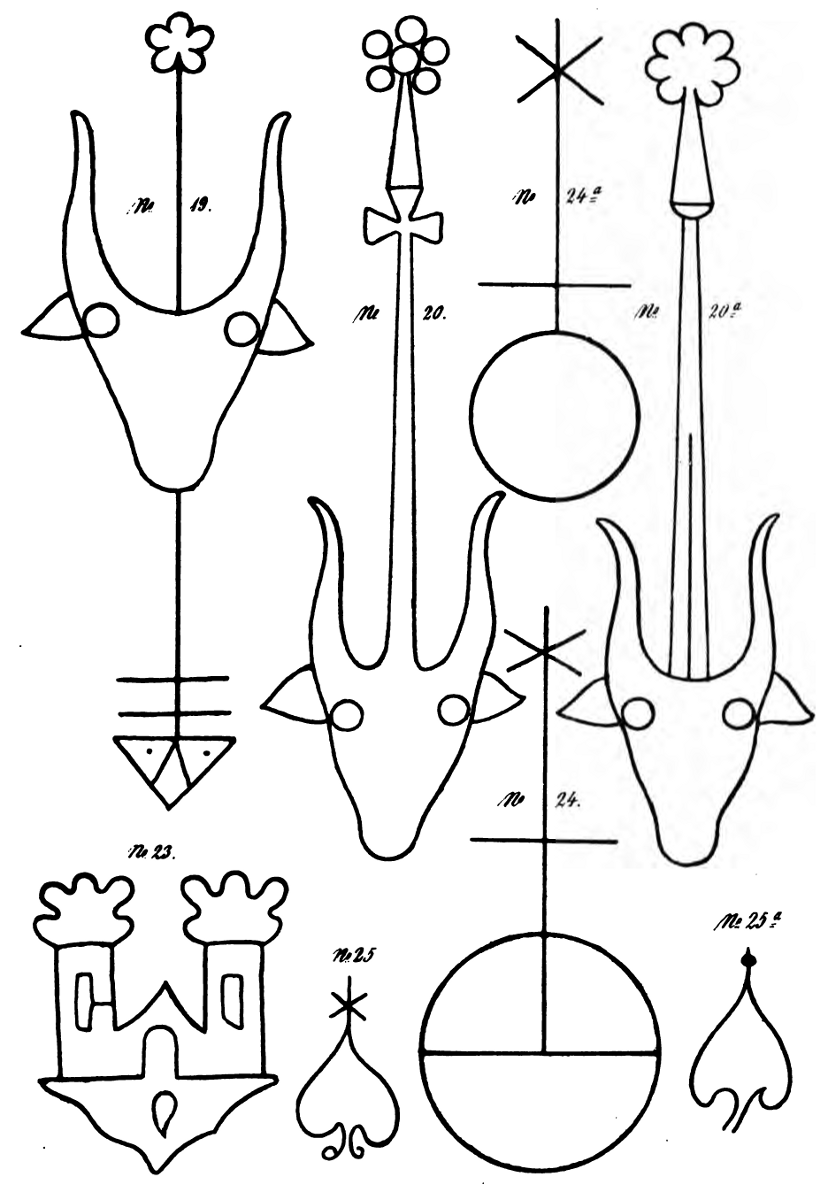 Das von Dürer zu seinen Kupferstichen benutzte Papier, mit jenem Wasserzeichen, wie solches auf den angefügten Tafeln unter Nr. 1 abgebildet ist, hat über dem Ochsenkopf einen einfachen Drathstrich mit einer 5-blättrigen Blume, unter demselben einen gleichen Strich, der mit einer dreieckigen Spitze und zwei Queerstrichen darüber endigt.