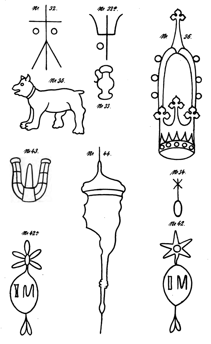 Um die Vergleichung zu erleichtern, habe ich von den wichtigsten Wasserzeichen Durchzeichnungen nehmen lassen und sind solche auf den angefügten Tafeln in der wirklichen Größe abgebildet. Ich muß indeß dabei bemerken, daß mehr oder mindere Abweichungen in den Formen dieser Fabrikzeichen nicht selten vorkommen. Von manchen Wasserzeichen ist es mir nicht möglich gewesen, eine genaue Durchzeichnung zu erhalten, und habe ich mich bei diesen daher, auf eine Angabe der Form derselben und die Entfernung der Drathlinien des Papiers beschränken müssen.