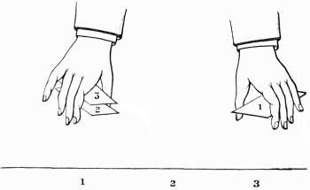 When the cards are taken up, preparatory to manipulation, they are held as indicated in fig. 1. First, the two indifferent cards are taken, one in each hand, and next, the king in the right hand. Card No. 2 in the illustration, therefore, is the king. In throwing down the cards at the outset No. 1 card is placed in position 1; No. 2 card in position 2; and No. 3 in position 3. Thus, the king occupies a position between the two other cards. So far, all is plain sailing, and it[16] is by no means difficult to trace the movements of the card we are following up, however deftly it may be manipulated. There is a saying that 'the quickness of the hand deceives the eye.' That is nonsense. No hand, however expert, can produce a movement so quick that the eye cannot detect it. What really deceives the eye in sleight of hand is that some of the movements are not exactly what they appear to be, their real nature is skilfully disguised. Of this the three card trick is a good example. When the sharp observes his pigeon getting ready to be plucked, he changes his tactics slightly from the straightforward course he has hitherto pursued. The cards appear to be thrown down in the same manner as before, but it is not so. In this case,[17] No. 1 card is thrown down in No. 1 position, as at the outset; but, instead of throwing down No. 2—the king—in No. 2 position, it is card No. 3 which is allowed to fall, and the king goes finally into position 3. Thus the uninitiated, instead of following up the king, as they fondly believe, are really on the trail of card No. 3.