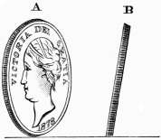 A coin which has been slightly bevelled to one side will bear a superficial examination without creating suspicion as to its genuineness. If it has a milled edge, it must necessarily be re-milled. Such a coin, when spun on edge, will always tend to fall in one direction. The bevelling, as shown in the figure, is exaggerated, for distinctness' sake; in practice, the angle is very slight.