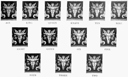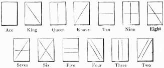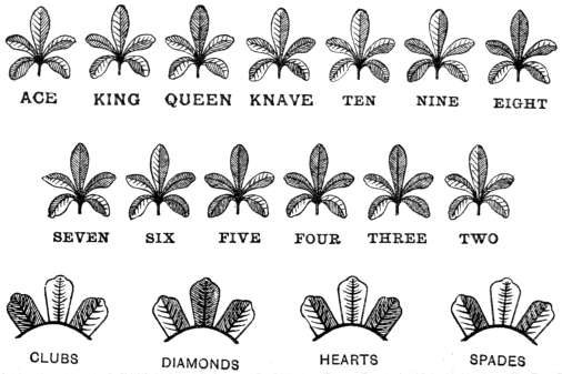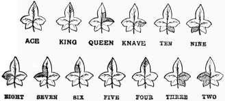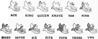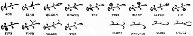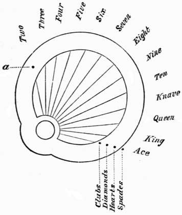'For suit pick out two figures near those you use for size, [303]and have both dark for Clubs, and both light or natural for Diamonds, have one of them dark for Spades; and the other dark for Hearts. With six figures the combination runs similar to the five figures which we have ezplained, and a four figure runs the same down to the seven spot. After a little practice you will see many ways of marking your cards.