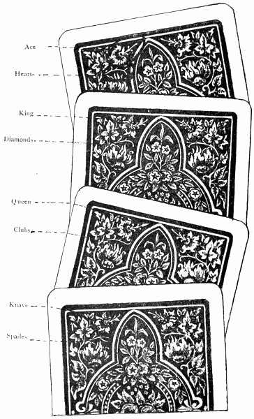 'Directions.—When you part the pack to shuffle press down a trifle and the cards will part to an Ace (the Ace will be on top of the lower part) put that part with the Ace on top and part again to another Ace now shuffle in all but the four top cards, part the cards again to the third Ace and shuffle in all but the top four cards, then put three cards on top of the last Ace (this puts up three Aces with three cards between them and three on top and is for a four handed game) if one more or less than four are playing shuffle in one more or less cards, (always have as many cards between and [305]on top of the Aces as there are players excluding yourself) when the left hand man deals and offers the cards to you to cut you can shuffle them up in the same way (but you must put "one less" card on top of the three Aces to get the Aces yourself)'