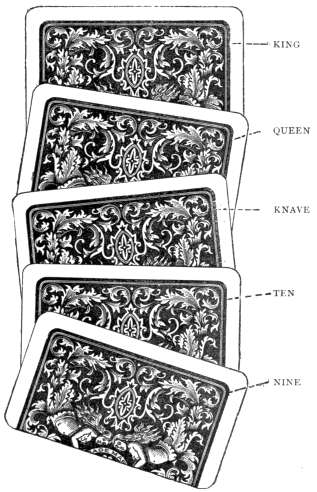 The most ordinary way of cheating at this game consists of 'putting up' hands for the dupe and one of the other players. The methods of accomplishing this manœuvre will be fully detailed in the chapter on 'Manipulation.' For the present, it is sufficient to say that the cards are so manipulated that the dupe has always a good hand. So far, this looks as though matters should prove very favourable to the dupe; therefore, he frequently goes 'Nap.' It always happens, however, that one of the other players holds a hand which is slightly better. The dupe may even hold the ace, king, queen, and knave of one suit, and the ace of another. By every law of the game he is bound to go 'Nap,' and win. So he makes his long suit trumps, feeling that he[24] has a 'certainty.' But when the cards are played, it turns out that one of his opponents holds five small trumps against his four big ones, and he loses on the last round.