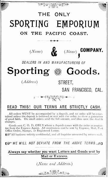 [310] The reader may have noticed, at the end of one of the price-lists, that the dealer is able to give references as to his trustworthiness to respectable firms 'who don't recommend advantage goods.' This will not be a matter for surprise when it is understood that the man is supposed to be an honest tradesman carrying on a reputable business. In all probability his referees would have no idea as to the sort of person to whose bona fides they are attesting. On the other hand, of course, they may know all about it, in which case they are manifestly no better than the man they are recommending. Still, even in that event, the reference is quite good enough for the sort of people who are likely to be buyers of swindling apparatus. The author has a few dollars' worth of this kind of thing; so perhaps the reader may be inclined to observe that 'Dwellers in glass houses,' &c. However, that's another matter. This book would never have been forthcoming if the author had any objection to a few pounds finding their way into the pockets of those who don't deserve them. The end must justify.
