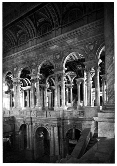 The most admired of the newer public buildings in Washington is the Congressional Library, on the plateau southeast of the Capitol, an enormous structure in Italian Renaissance, a quadrangle four hundred and seventy feet long and three hundred and forty feet wide, enclosing four courts and a central rotunda. It was finished in 1897, and cost about $6,200,000. Its elevated gilded dome and lantern are conspicuous objects in the view. This great Library, the largest in the country, is appropriately ornamented, and its book-stacks have accommodations for about five millions of volumes, the present number approximating one million, with nearly three hundred thousand pamphlets. The Pension Building is another huge structure, northwest of Capitol Hill, built around a covered quadrangle, which is used quadrennially for the "Inauguration Ball," a prominent Washington official-social function, which was adopted to relieve the White House from the former 24 feasting on the inauguration night. This house, accommodating the army of pension clerks, has running around the walls, over the lower windows, a broad band, exhibiting in relief a marching column of troops, with representations of every branch of the service. Seventh Street, which crosses Pennsylvania Avenue about midway between the Capitol and the Treasury, has to the northward the imposing Corinthian Post-office Building, formerly the headquarters of the postal service. Behind this is the Department of the Interior, popularly known as the Patent Office, as a large part of it is occupied by patent models. This is a grand Doric structure, occupying two blocks and embracing about three acres of buildings, the main entrance being a magnificent portico, seen from Pennsylvania Avenue. The new General Post-office Department Building is on Pennsylvania Avenue, covering a surface of three hundred by two hundred feet, and having a tower rising three hundred feet. It has just been completed. The Government Printing Office, where the public printing is done, and the Treasury Bureau of Engraving and Printing, where all the Government money issues and revenue stamps are made, are large and important buildings, though not specifically attractive in architecture.