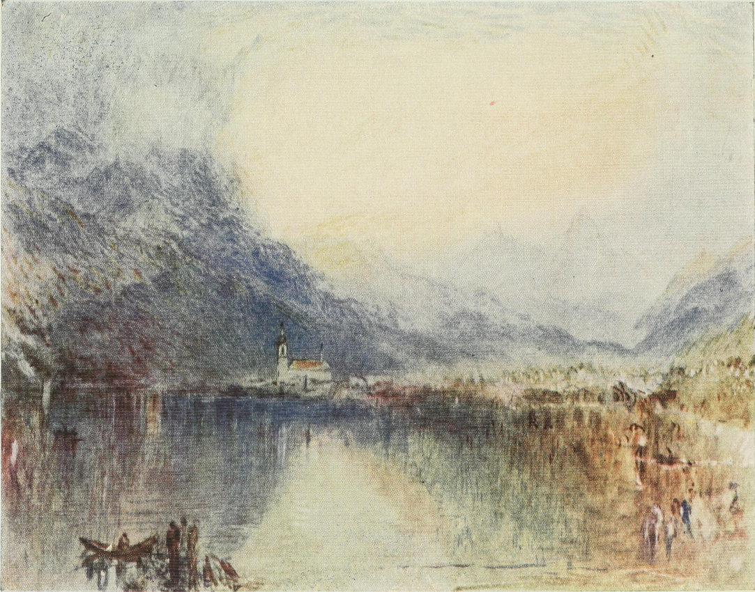 On the way we saw Italian workmen in blue trousers paving a road from cauldrons of molten asphalt. We watched the little flames leaping from the bubbling mass, and I drew from the sight an image of the art life of Turner: how he stoked his furnace with Poussin, Vandevelde,[Pg 21] and de Loutherbourg, and so brought to life his dark early works such as "The Shipwreck" and "Calais Pier"; how as he fed his fire with Claude, Crome, and Wilson the furnace glowed, and the world saw the ardour of "Ulysses Deriding Polyphemus," and the splendour of "Dido Building Carthage"; then when the flames leapt towards the sky there was pure Turner, the Turner of the "Téméraire" and the Venice dreams, a "Hastings" that has lost all earthly form; a dream boat passing between Headlands at Sunrise, and the later water-colours—the red Rigi, the blue Rigi, the blue and gold "Arth from the Lake of Zug," the moonlight Venice, and the atmospheric magic of the Lake of Uri.