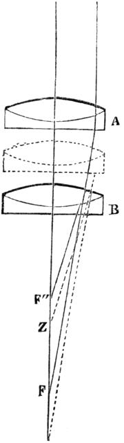 “If the two glasses which in the diagram are drawn at some distance apart are brought nearer together (if the place of A, for instance, is carried to the dotted figure), the rays transmitted by B in the direction of the longer aplanatic pencil of A will plainly be derived from some point Z more distant than F´´, and lying between the aplanatic foci of B; therefore (according to what has been stated) this glass, and consequently the combination, will then be spherically over-corrected. If, on the other hand, the distance between A and B is increased, the opposite effects are of course produced.