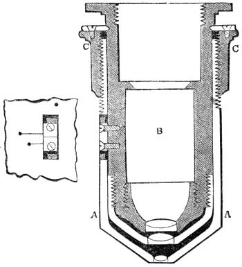 “The mechanism for applying these principles to the correction of an object-glass under the various circumstances, is represented in Fig. 18, where the anterior lens is set in the end[Pg 35] of a tube A A, which slides on the cylinder B containing the remainder of the combination; the tube A A, holding the lens nearest the object, may then be moved upon the cylinder B, for the purpose of varying the distance according to the thickness of the glass covering the object, by turning the screwed ring C C, or more simply by sliding the one on the other, and clamping them together when adjusted. An aperture is made in the tube A, within which is seen a mark engraved on the cylinder, and on the edge of which are two marks, a longer and a shorter, engraved upon the tube. When the mark on the cylinder coincides with the longer mark on the tube, the adjustment is perfect for an uncovered object; and when the coincidence is with the short mark, the proper distance is obtained to balance the aberrations produced by glass one-hundredth of an inch thick, and such glass can be readily supplied.