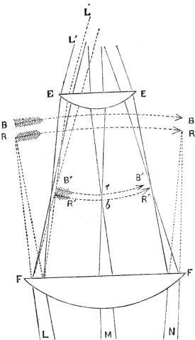 Let Fig. 20 represent the Huyghenean eye-piece of a microscope; F F and E E being the field-glass and eye-glass, and L M N the two extreme rays of each of the three pencils, emanating from the centre and ends of the object, of which, but for the field-glass, a series of colored images would be formed from R R to B B; those near R R being red, those near B B blue, and the intermediate ones green, yellow, and so on, corresponding with the colors of the prismatic spectrum. This order of[Pg 38] colors, it will be observed, is the reverse of that described in treating of the common compound microscope (Fig. 12), in which the single object-glass projected the red image beyond the blue. The effect just described, of projecting the blue image beyond the red, is purposely produced for reasons presently to be given, and is called over-correcting the object-glass as to color. It is to be observed also that the images B B and R R are curved in the wrong direction to be distinctly seen by a convex eye-lens, and this is a further defect of the compound microscope of two lenses. But the field-glass, at the same time that it bends the rays and converges them to foci at B´ B´ and R´ R´, also reverses the curvature of the images as there shown, and gives them the form best adapted for distinct vision by the eye-glass E E. The field-glass has at the same time brought the blue and red images closer together, so that they are adapted to pass uncolored through the eye-glass. To render this important point more intelligible, let it be supposed that the object-glass had not been over-corrected, that it had been perfectly achromatic; the rays would then have become colored as soon as they had passed the field-glass; the blue rays, to take the central pencil, for example, would converge at b and the red rays at r, which is just the reverse of what the eye-lens requires; for as its blue focus is also shorter than its red, it would demand rather that the blue image should be at r and the red at b. This effect we have shown to be produced by the over-correction of the object-glass, which protrudes the blue foci B B as much beyond the red foci R R as the sum of the distances between the red and blue foci of the field-lens and eye-lens; so that the separation B R is exactly taken up in passing through those two lenses, and the whole of the colors coincide as to focal distance as soon as the rays have passed the eye-lens. But while they coincide as to distance, they differ in another respect; the blue images are rendered smaller than the red by the superior refractive power of the field-glass upon the blue rays. In tracing the pencil L, for instance, it will be noticed that after passing the field-glass, two sets of lines are drawn, one whole, and one dotted, the former representing the red, and the latter the blue rays. This is the accidental effect in the Huyghenean eye-piece pointed out by Boscovich. This[Pg 39] separation into colors at the field-glass is like the over-correction of the object-glass; it leads to a subsequent complete correction. For if the differently colored rays were kept together till they reached the eye-glass, they would then become colored, and present colored images to the eye; but fortunately, and most beautifully, the separation effected by the field-glass causes the blue rays to fall so much nearer the centre of the eye-glass, where, owing to the spherical figure, the refractive power is less than at the margin, that the spherical error of the eye-lens constitutes a nearly perfect balance to the chromatic dispersion of the field-lens, and the red and blue rays L´ and L´´ emerge sensibly parallel, presenting, in consequence, the perfect definition of a single point to the eye. The same reasoning is true of the intermediate colors and of the other pencils.
