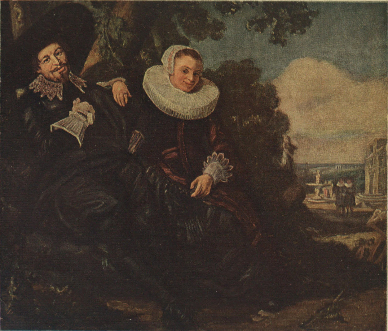 And there they sit, Franz and Lysbeth, all in a garden green, under a shady oak tree, with a vision of architectural gardens and open fertile country beyond. The pose was most certainly her idea, not his, for she is smiling most good-humouredly at having gained her end! He would be up and off, but she checks his movement, and the hand-grasp upon his shoulder is a reminder of the sweet restraint of happy married life.