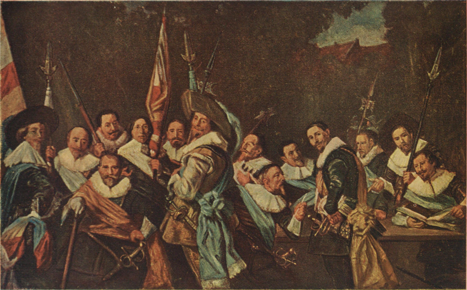 Painted in 1633. This, the second group of the St. Adriaen Officers, is the finest of all the five "Schutters-Doelen" at Haarlem. For clever arrangement of the figures and instantaneous catch of character it is unsurpassed. The armourer had furbished up the old halberds of the Company, which, with the banners, are quite significant features. The costumes are peculiarly rich and the sashes gaily ample; whilst the variety of ruffs and collars, and the trimming of the beards, indicate the vagaries of fashion. The Colonel—Jan Claesz Van Loo, with his hunt-stick—no doubt he was getting gouty!—sits, looking at you full in the face. The other Officers have all their eyes upon you; they are inviting you to join in their conviviality. The background of trees and farm-buildings suggests the delights of a picnic in the open air.