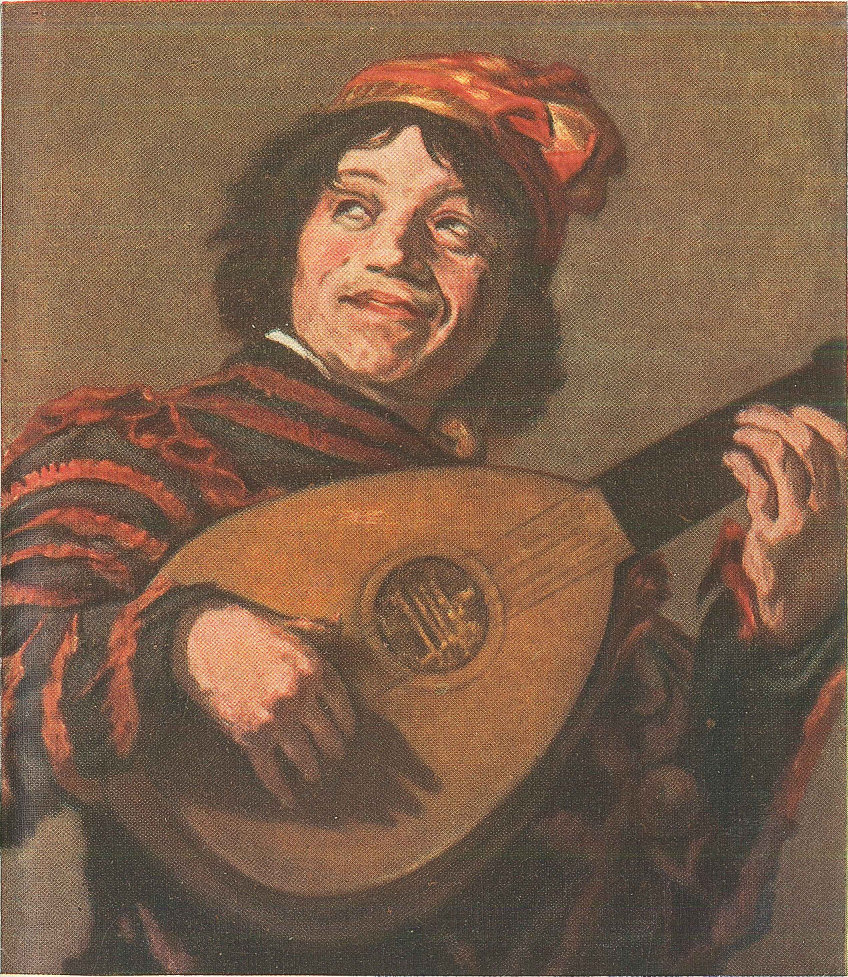It is a "snapshot," so to speak, of Adriaen Brouwer, one of Hals' favourite and most distinguished pupils, whose renown as a painter of peasant genre was equalled by his fame as an archplayer of practical jokes and as a brilliant musician and improvisatore. Here he is, in fancy Spanish dress, red and yellow, with a real old Hispano-Moorish mandoline. His nickname in the studios was "Der Naar!" "Funny Fellow!" His face—clean-shaven, but still something of a stranger to soap and water—reflects, with amazing truthfulness and vitality, the emotions of the moment.