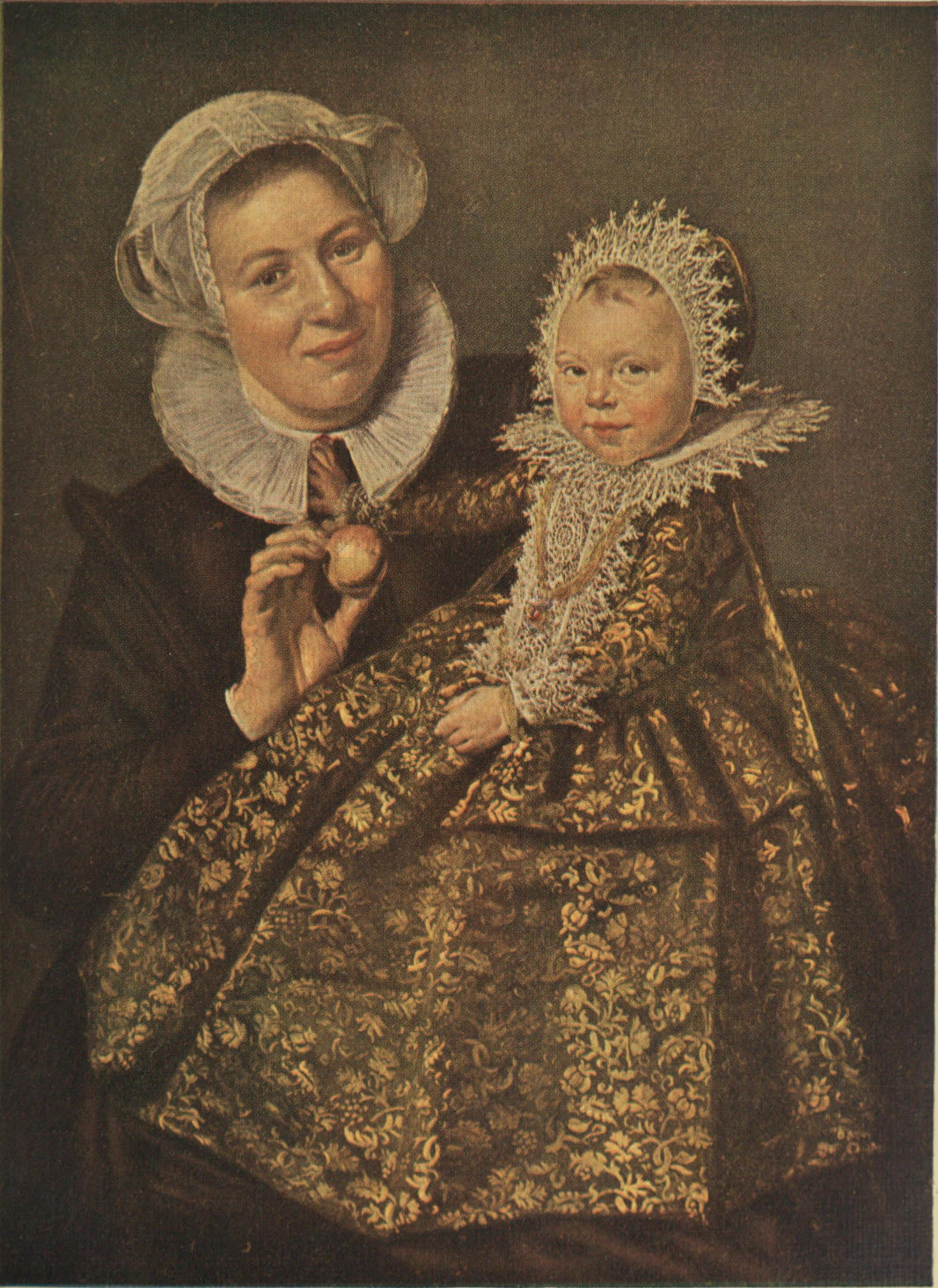 Painted in 1630. This is one of the very best of all Hals' compositions. The Nurse is a buxom lass of North Holland, and the Child, the little son of Mijnheer Julius Ilpensteen, a wealthy German merchant, settled at Haarlem, and engaged in tulip-growing. The expression of the youngster, just about to explode with laughter at something droll which has caught his eye, and then shyly to bury his head in his crooning nurse's bosom, has been caught quite wonderfully. The dress is rich, and the Mechlin lace collar is so actual that it might really be a "piece" cut off and pasted on the canvas! It is said that Hals had been twitted with his fondness for dirty, unkempt children as models for his snapshots of character, here he has vindicated his sense of elegance.