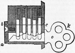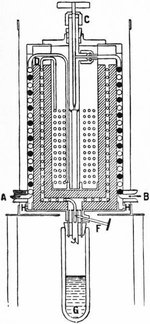 The change of temperature due to the Thomson-Joule effect varies in amount with different gases, or rather with the temperature at which the operation is conducted. At ordinary temperatures oxygen and carbonic acid are cooled, while hydrogen is slightly heated. But hydrogen also is cooled if before being passed through the nozzle or plug it is brought into a thermal condition comparable to that of other gases at ordinary temperatures—that is to say, when it is initially cooled to a temperature having the same ratio to its critical point as their temperatures have to their critical points—and similarly the more condensible gases would be heated, and not cooled, by passing through a nozzle or plug if they were employed at a temperature sufficiently above their critical points. Each gas has therefore a point of inversion of the Thomson-Joule effect, and this temperature is, according to the theory of van der Waals, about 6.75 times the critical temperature of the body. Olszewski has determined the inversion-point in the case of hydrogen, and finds it to be 192.5° absolute, the theoretical critical point being thus about 28.5° absolute. The cooling effect obtained is small, being for air about ¼° C. per atmosphere difference of pressure at ordinary temperatures. But the decrement of temperature is proportional to the difference of pressure and inversely as the absolute temperature, so that the Thomson-Joule effect increases rapidly by the combined use of a lower temperature and greater difference of gas pressure. By means of the “regenerative” method of working, which was described by C. W. Siemens in 1857, developed and extended by Ernest Solvay in 1885, and subsequently utilized by numerous experimenters in the construction of low temperature apparatus, a practicable liquid air plant was constructed by Linde. The gas which has passed the orifice and is therefore cooled is made to flow backwards round the tube that leads to the nozzle; hence that portion of the gas that is just about to pass through the nozzle has some of its heat abstracted, and in consequence on expansion is cooled to a lower temperature than the first portion. In its turn it cools a third portion in the same way, and so the reduction of temperature goes on progressively until ultimately a portion of the gas is liquefied. Apparatus based on this principle has been employed not only by Linde in Germany, but also by Tripler in America and by Hampson and Dewar in England. The last-named experimenter exhibited in December 1895 a laboratory machine of this kind (fig. 2), which when supplied with oxygen initially cooled to −79° C., and at a pressure of 100-150 atmospheres, began to yield liquid in about a quarter of an hour after starting. The initial cooling is not necessary, but it has the advantage of reducing the time required for the operation. The efficiency of the Linde process is small, but it is easily conducted and only requires plenty of cheap power. When we can work turbines or other engines at low temperatures, so as to effect cooling through the performance of external work, then the economy in the production of liquid air and hydrogen will be greatly increased.